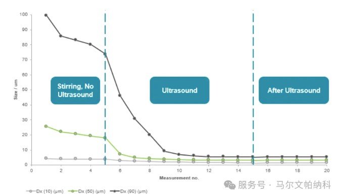 样品被充分分散是粒径方法开发过程中的关键步骤,湿法分散中通常会采用超声打开团聚体。然而,对于经验较少的用户来说,找到那个既能实现分散又能避免不良副作用的“最佳点”,如何确定超声强度和时间,可能是一项挑战。随着Mastersizer 3000+的SOP架构师中增加了超声波滴定功能,优化湿法样品的分散条