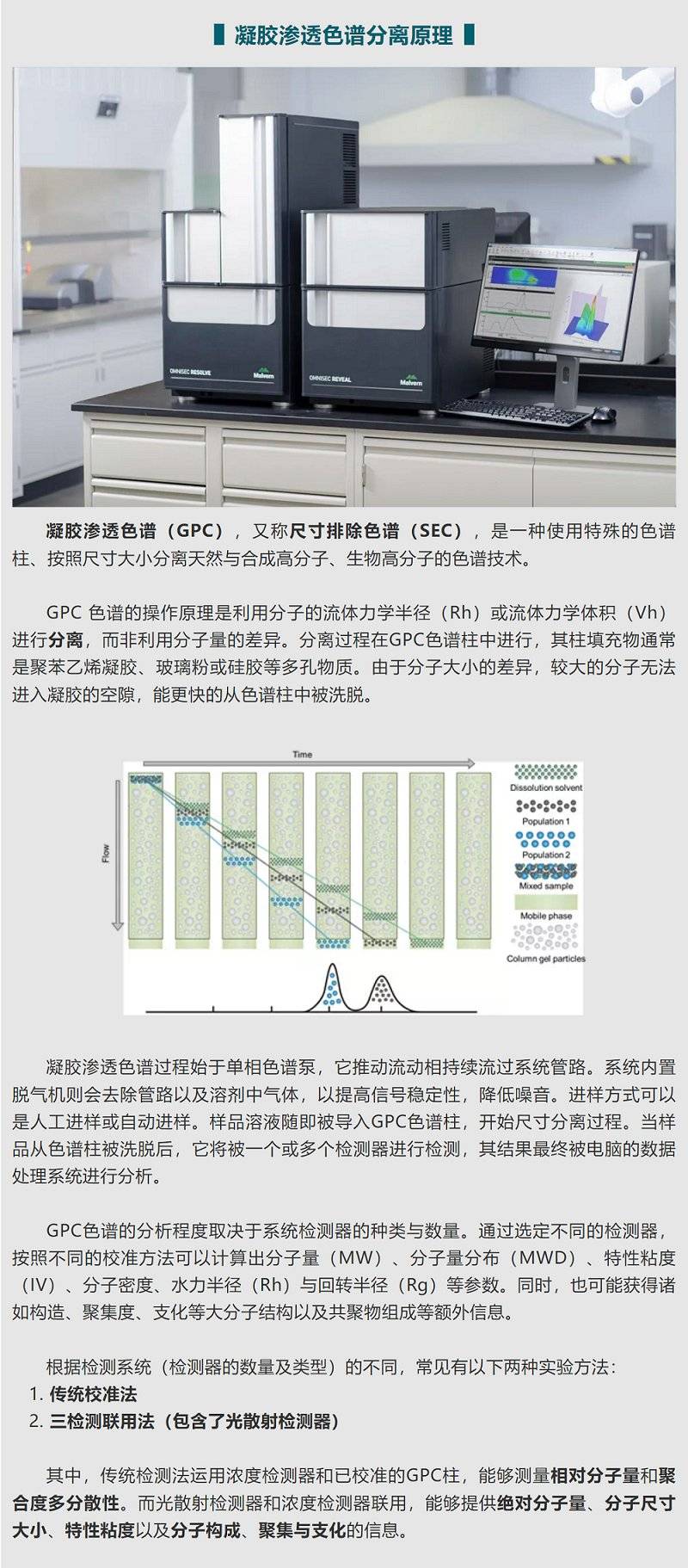 高级多检测器GPC测量低分子量样品凝胶渗透色谱(GPC)是测量天然和合成聚合物分子量和分子量分布的常见工具。先进的光散射检测器,越来越多地被用来克服传统GPC测量的局限性,准确提供绝对分子量以及分子尺寸。由于样品的光散射(Rθ)灵敏度会受到聚合物的分子量Mw、浓度(C)和折光指数增量(dn/dc)的